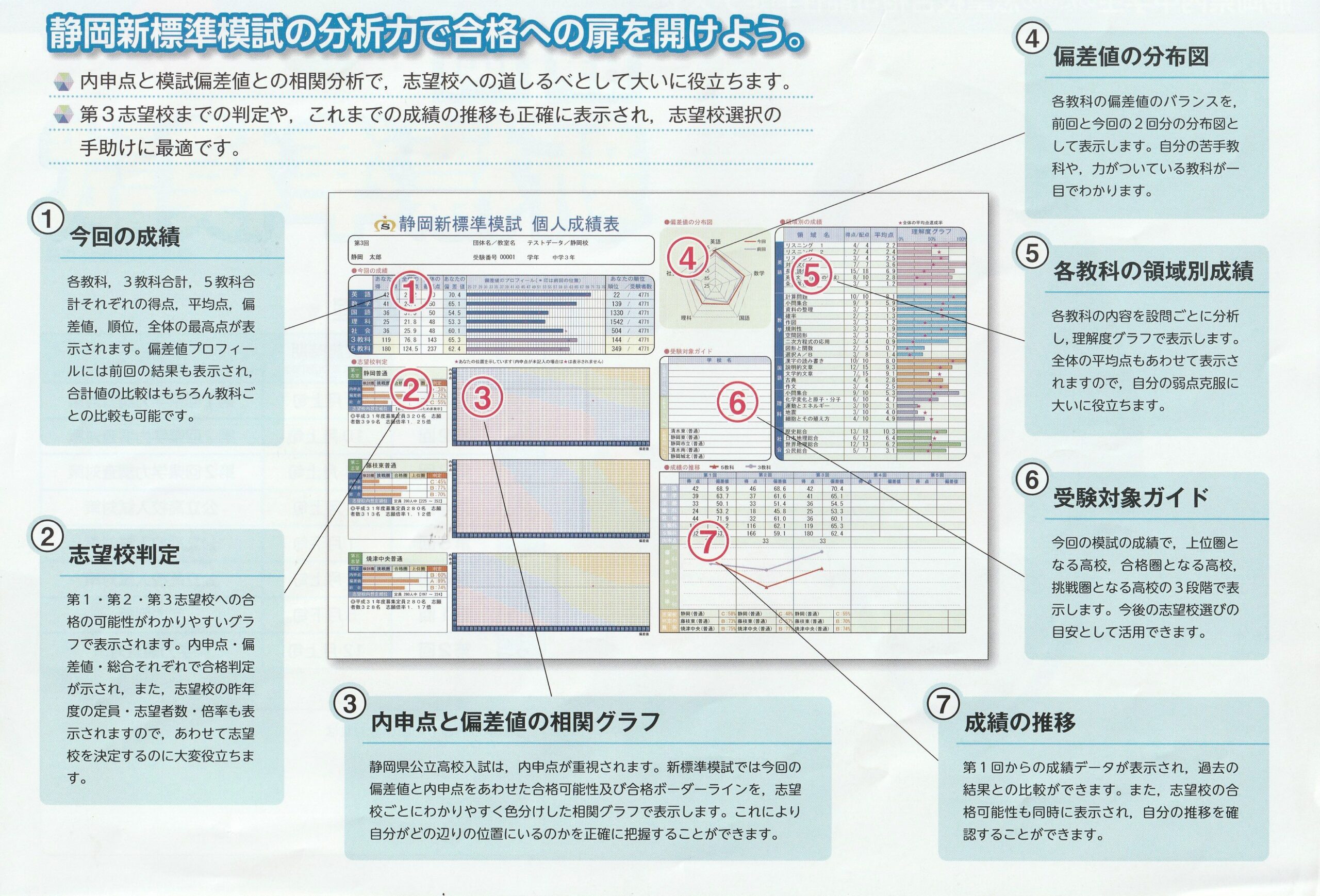 テストの結果を分析した個人成績表では、今回の成績から志望校判定、偏差値と分布図が表記されるので、受験した学生は、静岡県の他の学校の同い年の人と比べた時に、自分が今どのくらいの順位にいるのかを明確にすることができ、受験に向けたモチベーションに繋げることができます。